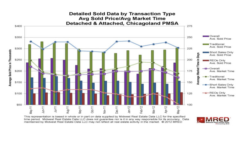 All transaction types are showing a month-over-month increase in average sold price. In fact, MRED reports three consecutive months of overall average sale price increases, with a jump of over twenty-six percent (26%) since February 2012. The average market time has been declining since April 2012 throughout all the different transaction type segments.