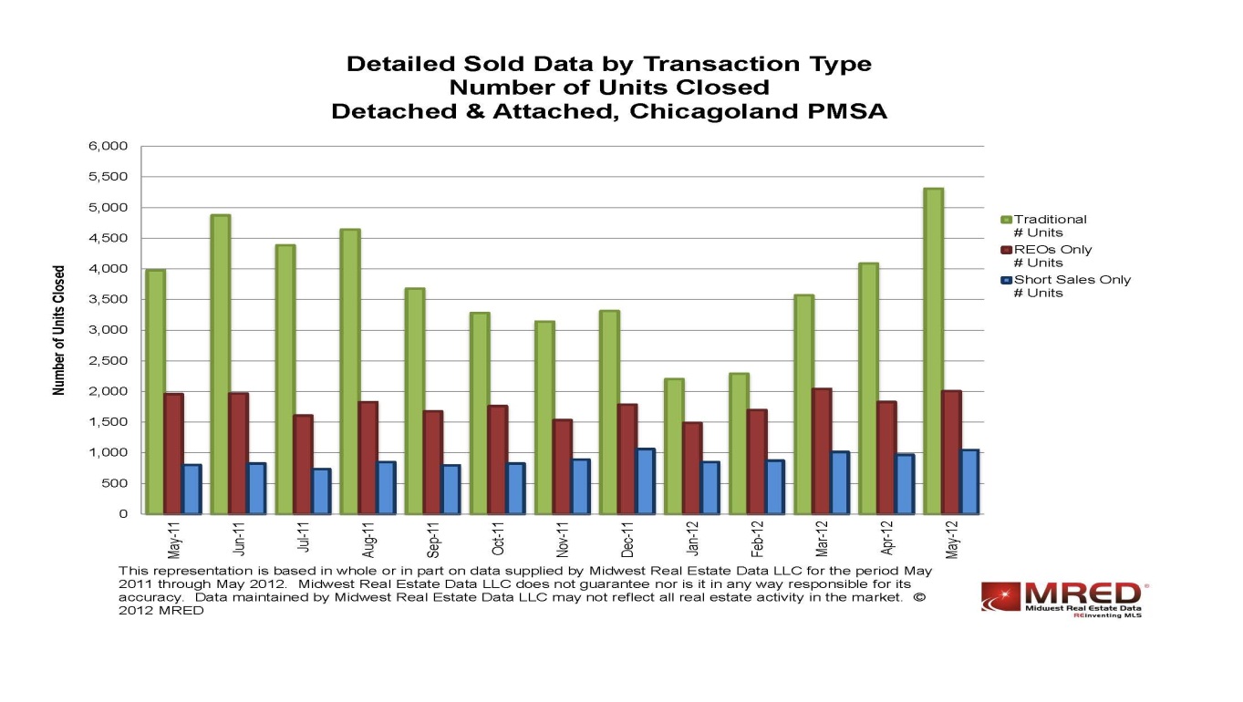 Focusing on its own vast database, MRED uncovered some other promising numbers. May 2012 closed transactions were up almost twenty-five percent (25%) over May 2011. Traditional transactions (versus foreclosure/REOs and short sales) are a growing segment of the overall market, up from forty-seven percent (47%) of all transactions in February 2012, to over sixty-three percent (63%) at the end of May.