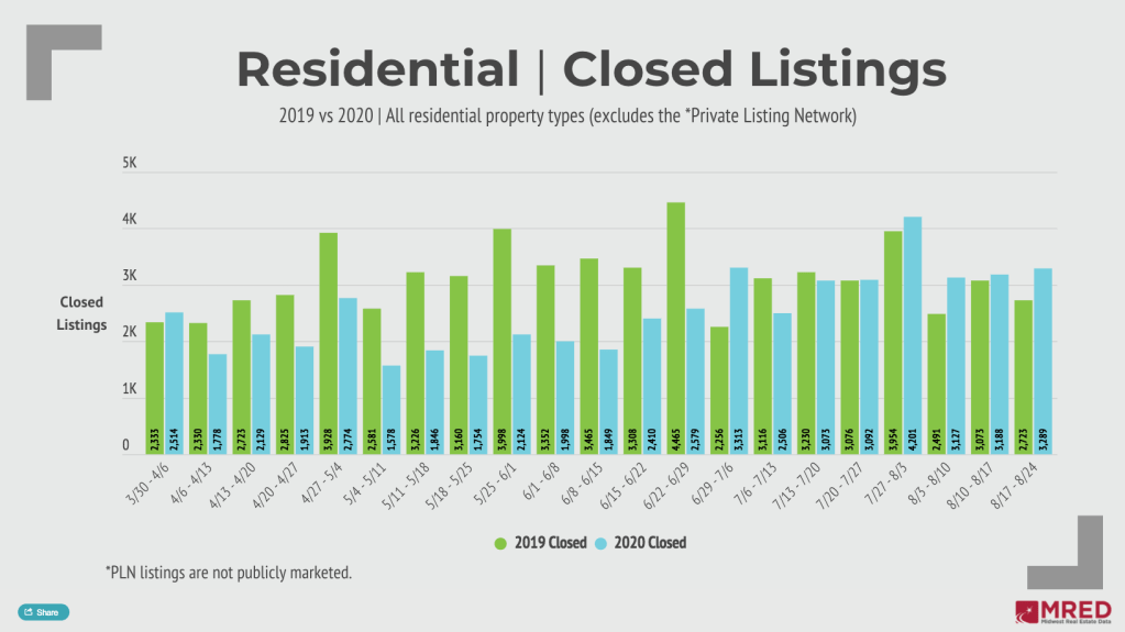 New listings in MRED’s system remained steady, continuing its month-and-a-half-long streak of stability. August’s third week saw 16% improvement year over year for new listings, while listings under contract were up 75% compared to 2019.