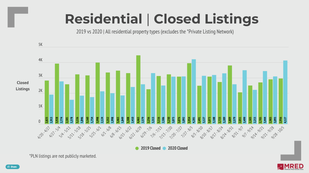 4,127 residential listings closed in MRED’s marketplace during the week of 9/28. That total is the most in a single week since late July, notching a 33% week-over-week increase. The 40% year-over-year bump was the second time in the last month 2020’s closed totals bested 2019 by 40% or more.