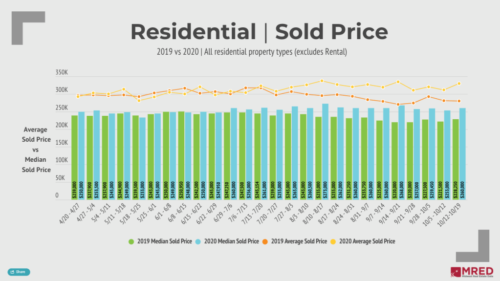 The median residential sales price in MRED’s service area reached its highest mark in a month for the week ending Oct. 18. At $260,000, the median price was a 2.8% week-over-week increase and topped 2019’s price for the same week by 13.9%.
