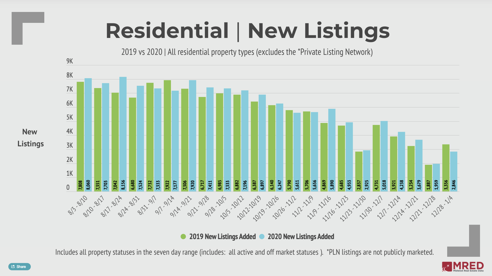 The start of the new year saw a 45% week-over-week increase in new listings across MRED’s market. The weekly rebound fell 15% short of the previous year’s numbers during the same period, although open houses nearly doubled week-over-week, signaling a potential strong start to the year. Learn more in MRED’s Weekly Market Snapshot.