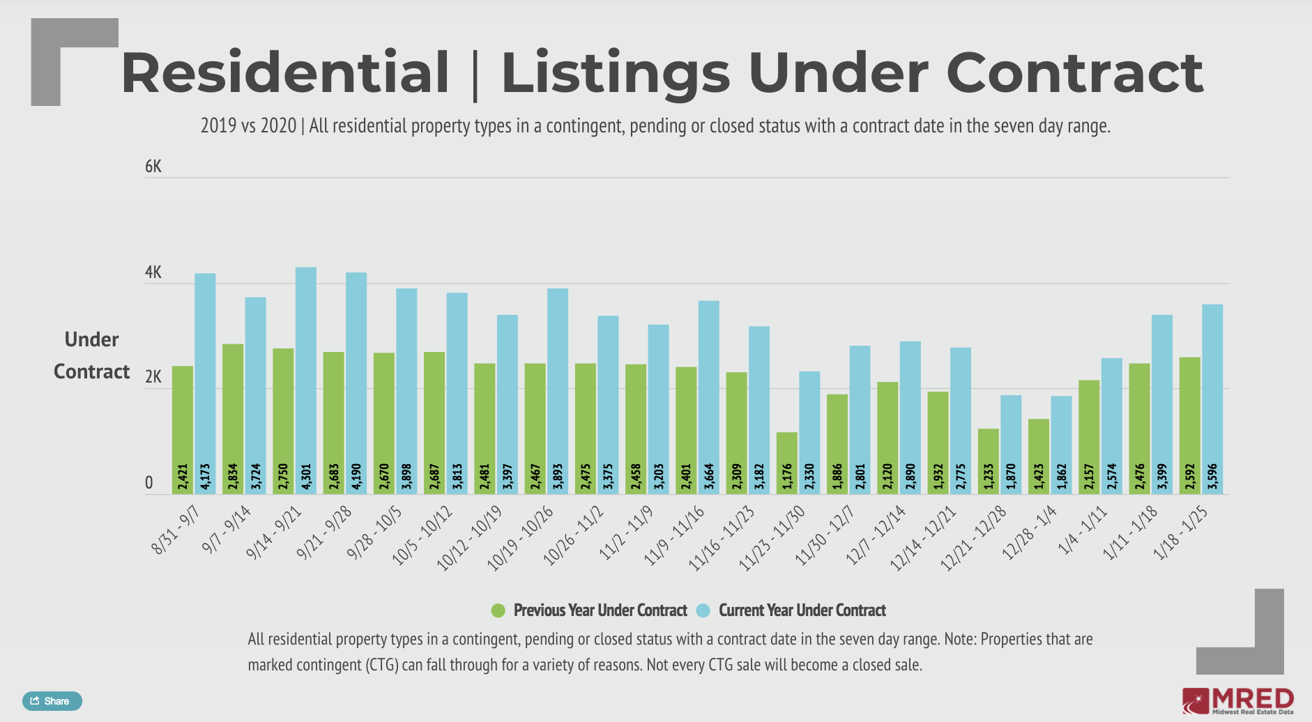 Listings under contract in MRED’s marketplace continued to outperform numbers from previous years, extending a run of year-over-year increases that goes back to May of 2020. This leading indicator reflected a 39% increase over the same time last year. This trend continued even as other indicators dipped on a weekly basis, including new and closed listings.