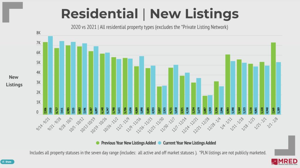 Five weeks into the year new, MRED’s marketplace is still awaiting the increase in new listings that accompanies the start of the spring market. During the same week that saw an 80% jump in new listings in 2020, the year 2021 brought just a 7% bump. This while several other key market indicators remained largely steady week-to-week, indicating the busy season is still yet to come.