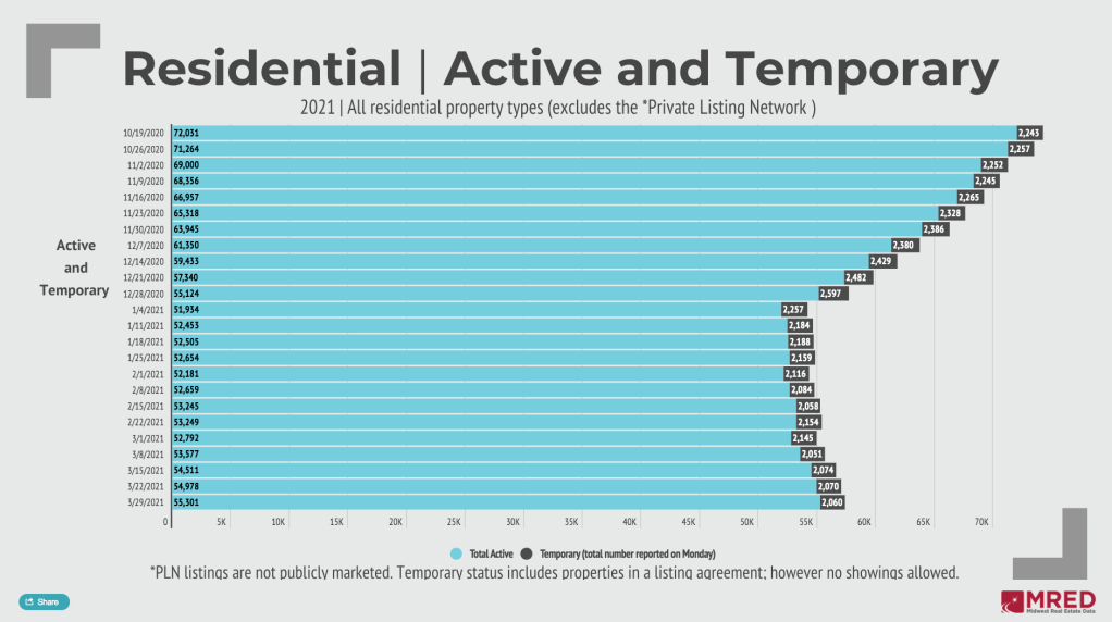 Inventory remains low in MRED’s marketplace, but the total number of active listings in connectMLS rose for the fourth straight week. The 55,301 total active listings was also the highest weekly mark since mid-December.