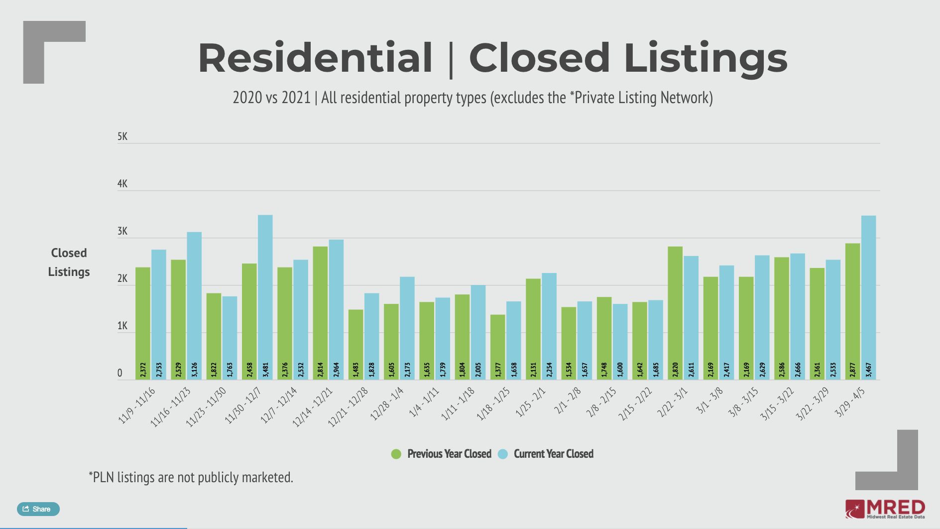 Closed listing totals in MRED’s marketplace saw one of its first major jumps of the year last week. The 37% week-over-week increase accompanied a 21% year-over-year increase in closed listings.