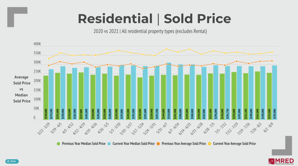 The residential median sales price in MRED’s marketplace increased 2% week-over-week. The $295,000 median mark is the highest price in five weeks, also besting last year’s same-week total by 16%.