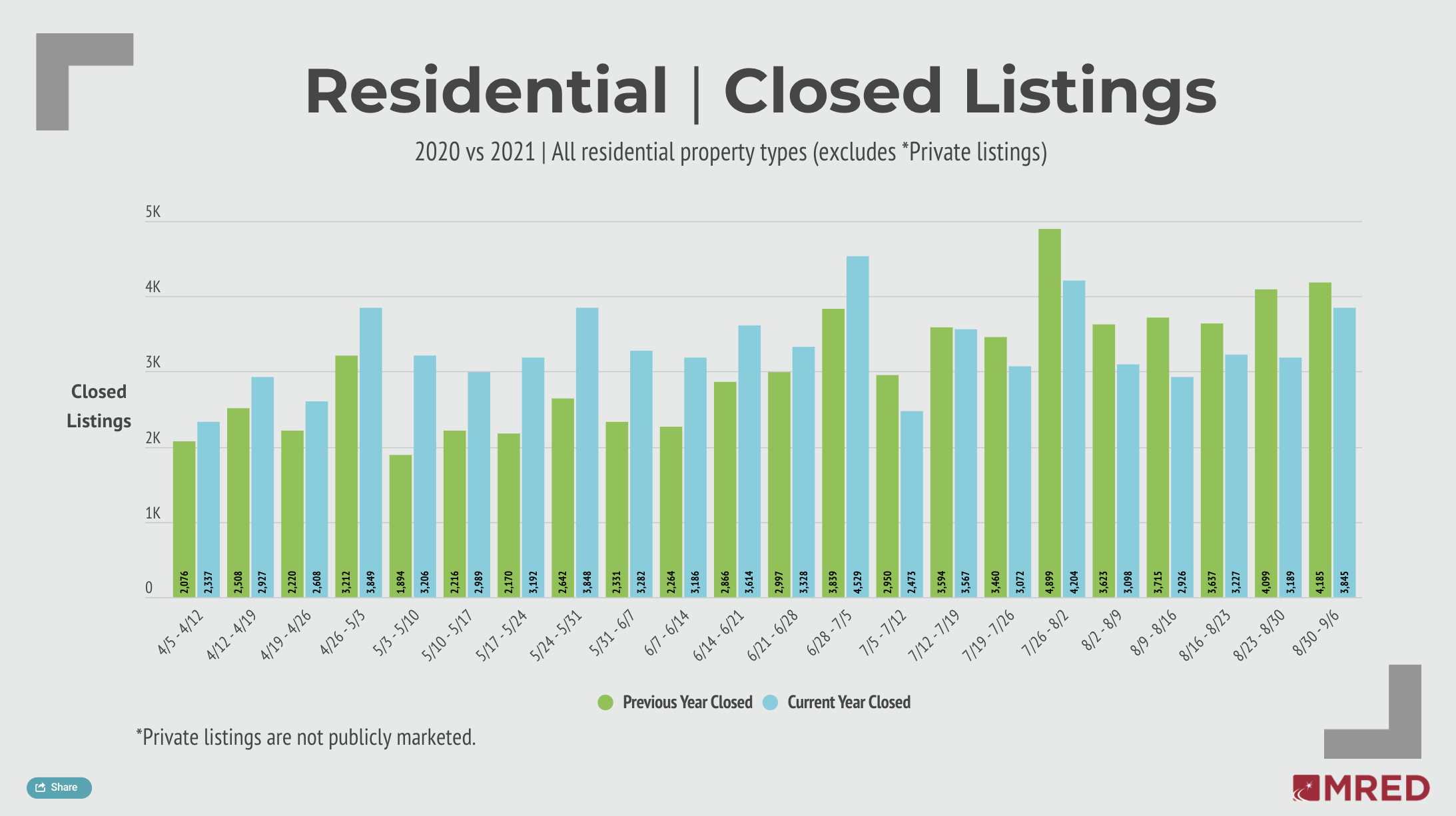 Closed listings in MRED’s marketplace notched a top five weekly finish for the year so far. Despite the strong showing, the 3,845 closings for Aug. 30-September 6 was off from the same week last year by 8 percent.