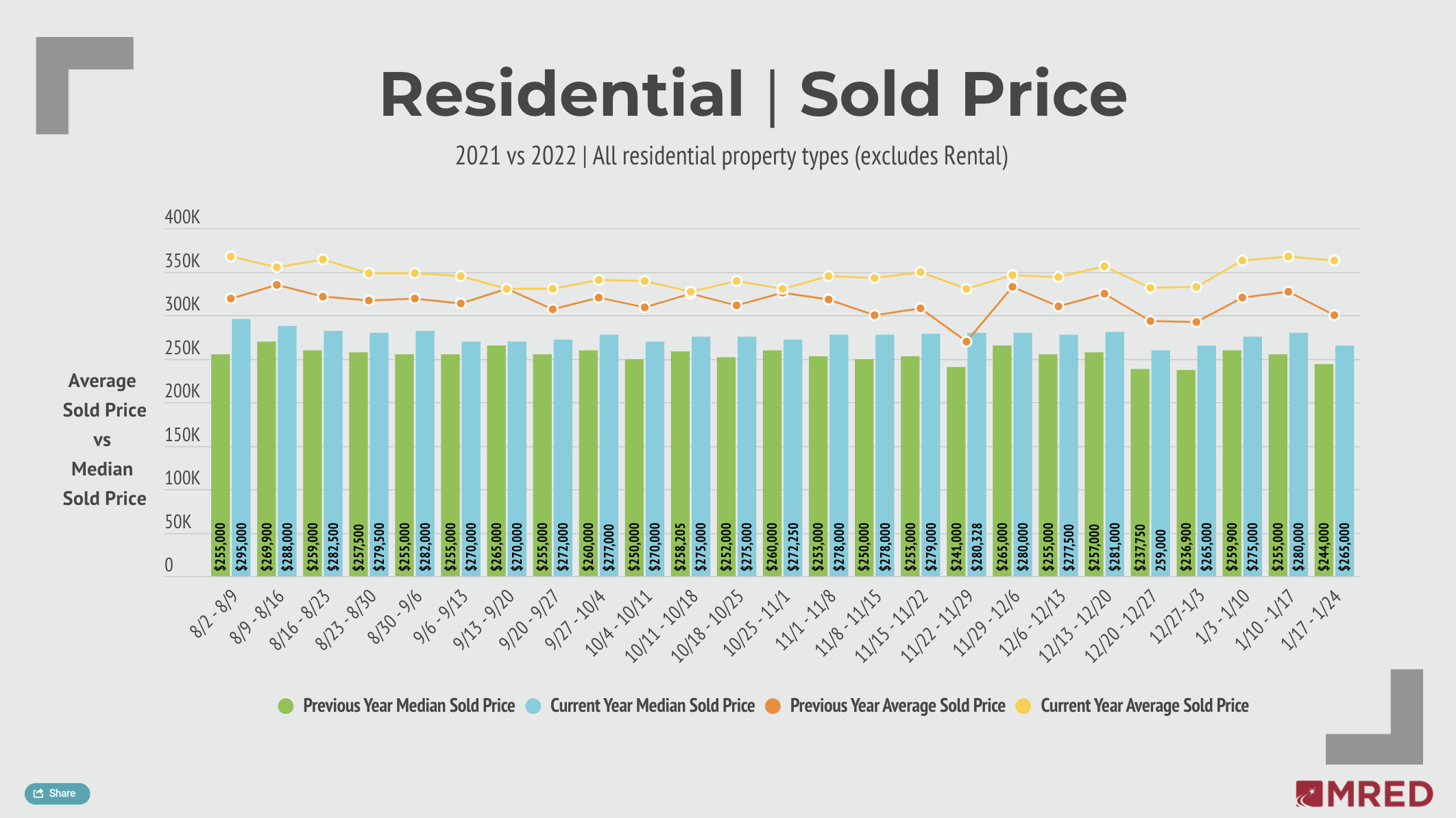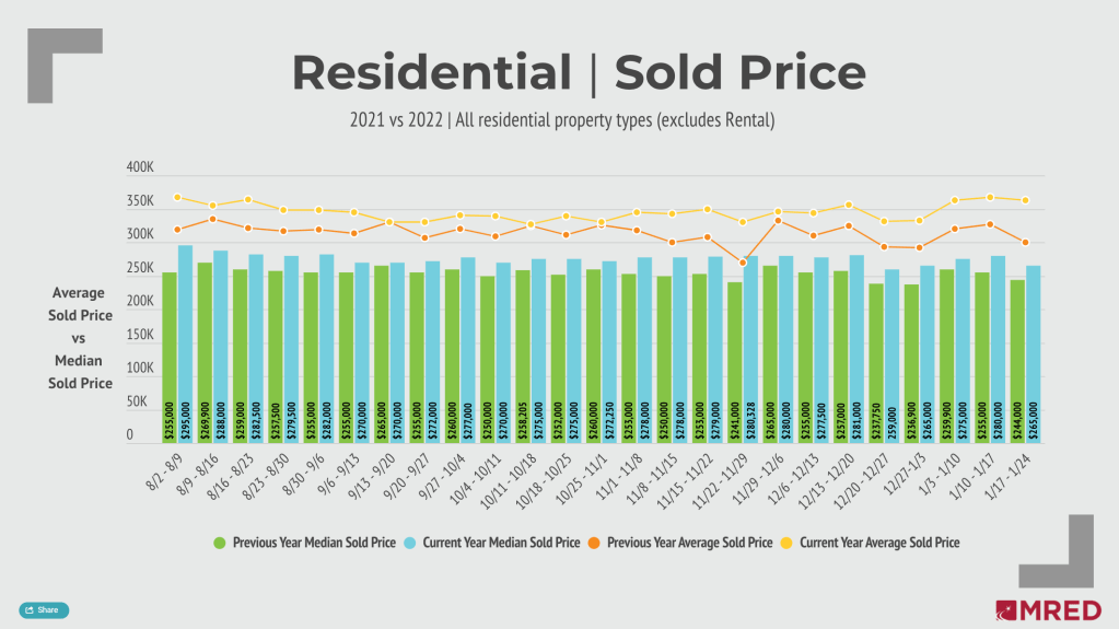 The median residential sales price in MRED’s marketplace fell 5% week-over-week during the third week of January. The $265,000 median price still bested 2021’s total by 9%.
