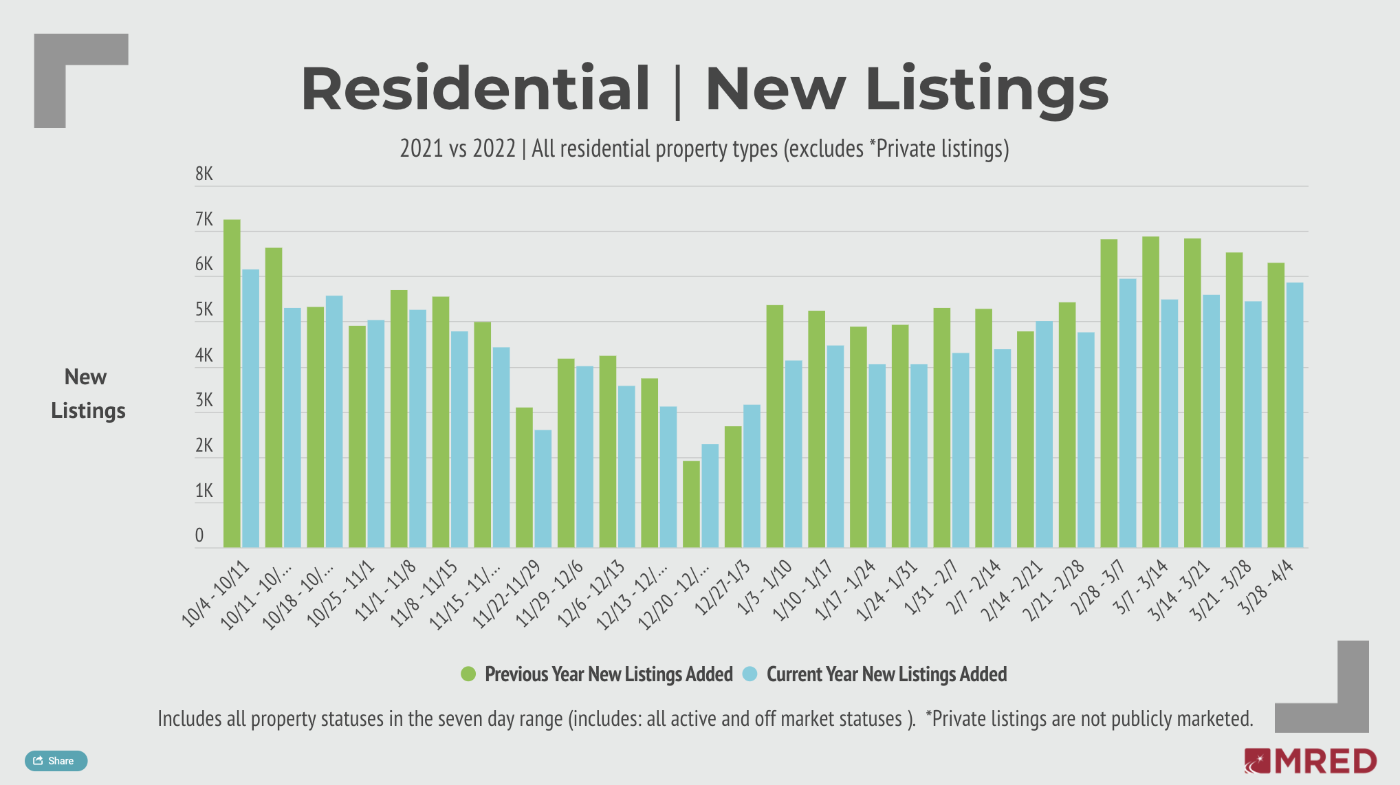 Last week saw an 8% week-over-week increase in new listings across MRED’s marketplace. This bump brought on the second-most new listings in a single week since the new year began. The 5,868 new listings fell 7% short of that metric in the same span from the previous year.
