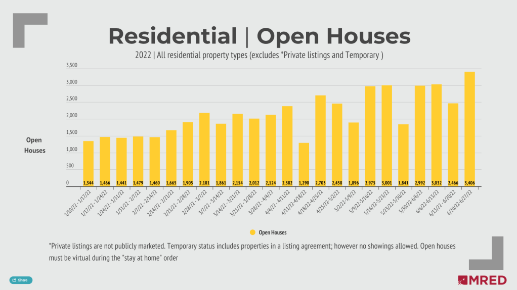 MRED’s residential marketplace saw 3,406 showings last week. That total was a 38% week-over-week increase and the most showings in a single week since September.