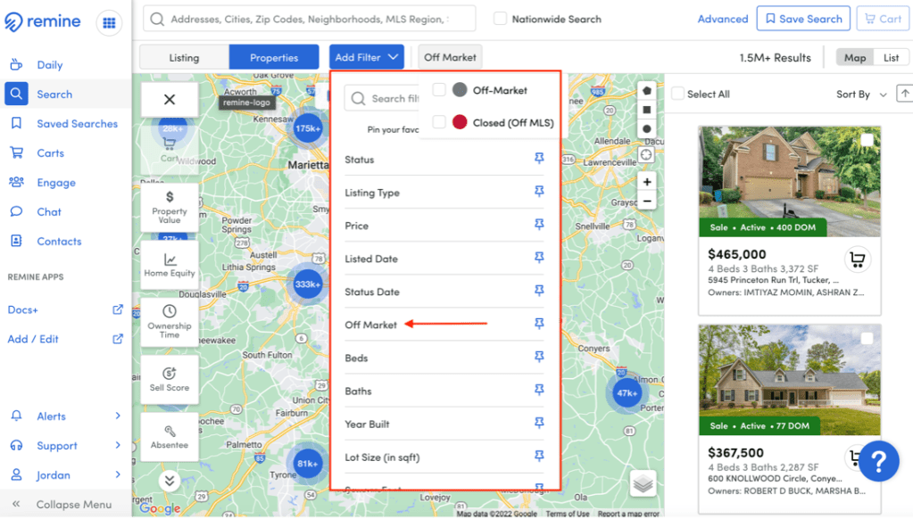 After defining an area you are interested in targeting, you can hone your search by filtering out properties that are not currently on the market or recently closed with the Off-Market filter. The Off-Market filter combined with the Ownership Time and Sell Score filters can help predict how likely a property is to list within the next 6 to 12 months. The Sell Score is based upon several data points, including allowing you better target a potential listing lead with the Off-Market filter. The Off-Market filter, combined with the Ownership Time and Sell Score filter, can help predict how likely a property is to list within the next 6 to 12 months. The Sell Score is based upon several data points, including market trends, public record, and census data, allowing you to target potential listings more effectively.