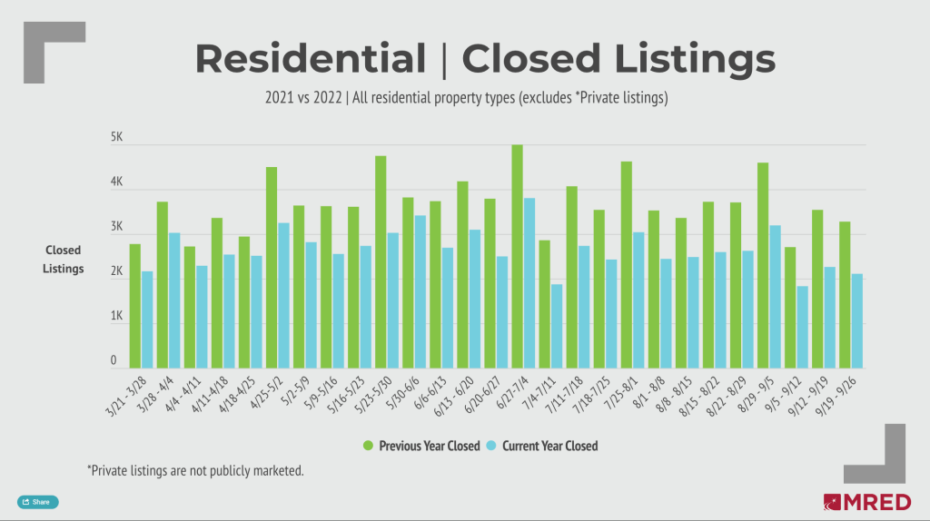 The number of closed residential listings in MRED’s marketplace registered week-over-week and year-over-year declines during September’s final full week. A total of 2,118 listings closed last week, compared to 3,274 during the same span in 2021, a 35% drop. This number was also a 6% weekly decrease.