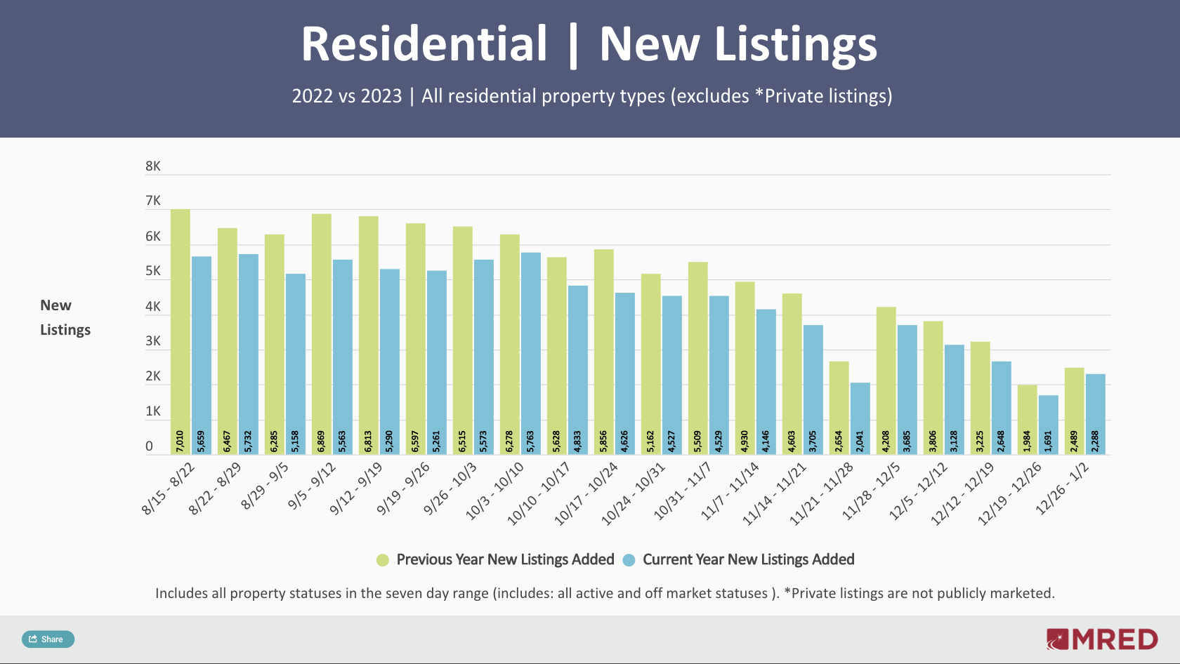 New residential listings in MRED’s marketplace began to increase as the calendar flipped to 2023. Last week’s 2,288 new listings marked a 35% week-over-week increase while falling 8% short of the same key market indicator during the same span last year.