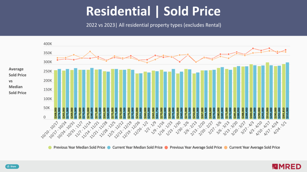 The final week of April saw a major increase in MRED marketplace residential median sales price. The $310,000 mark in that metric was a 6% week-over-week jump and a 3% annual bump. That is the largest single-week total since July of 2022.