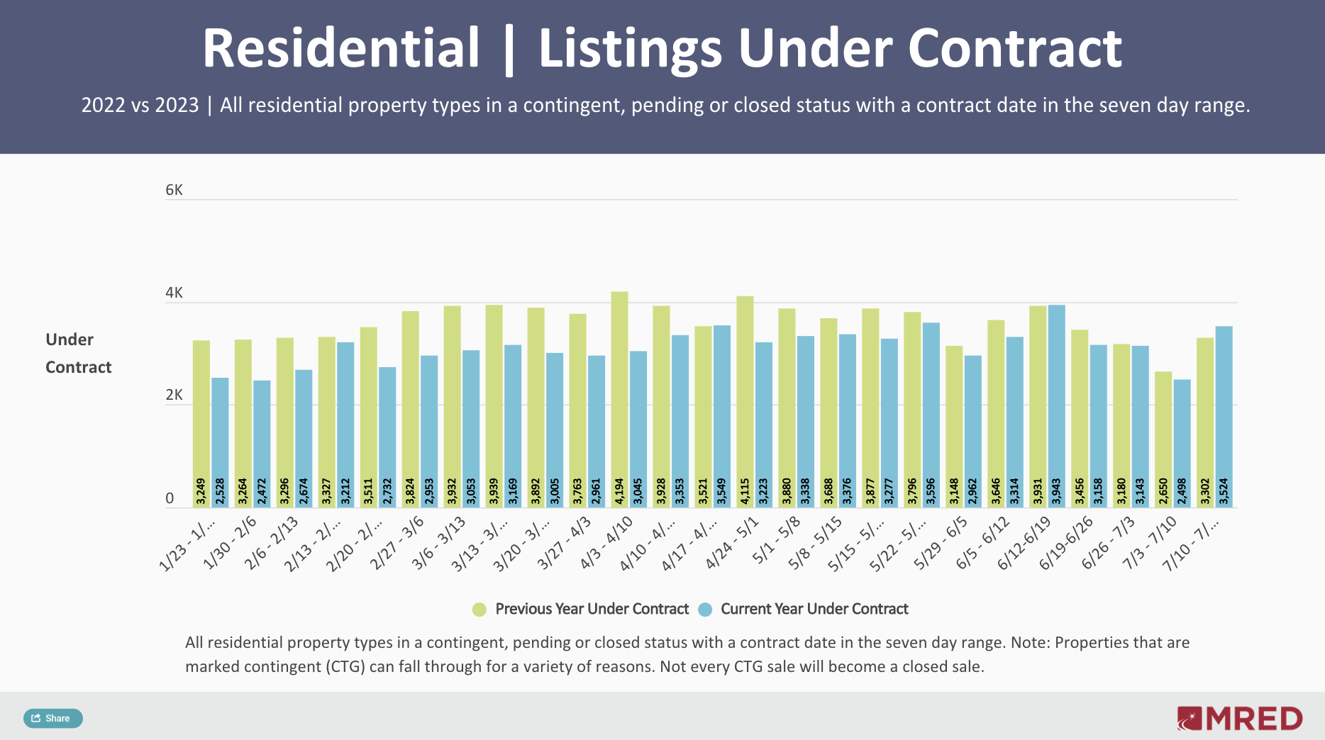 MRED’s residential marketplace saw weekly and annual increases in listings under contract last week. The 3,524 contracts marked a 41% week-over-week increase and a four-week high. It was also a 7% year-over-year bump.
