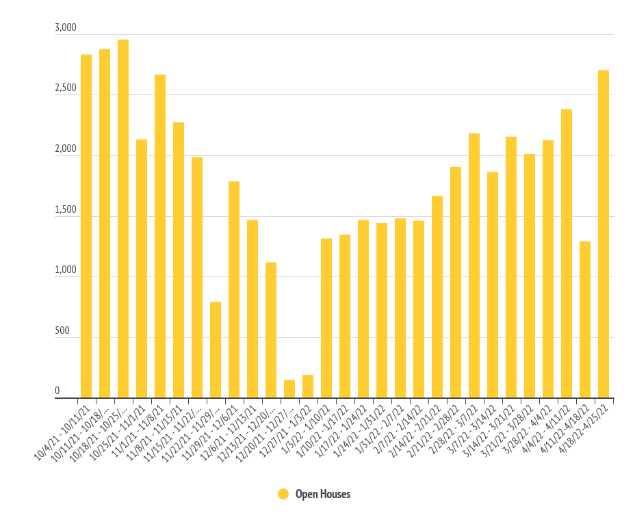 Spring has sprung and so have eager home sellers. The number of open houses among MRED marketplace’s residential listings more than doubled last week, reaching their highest number since October 2021.