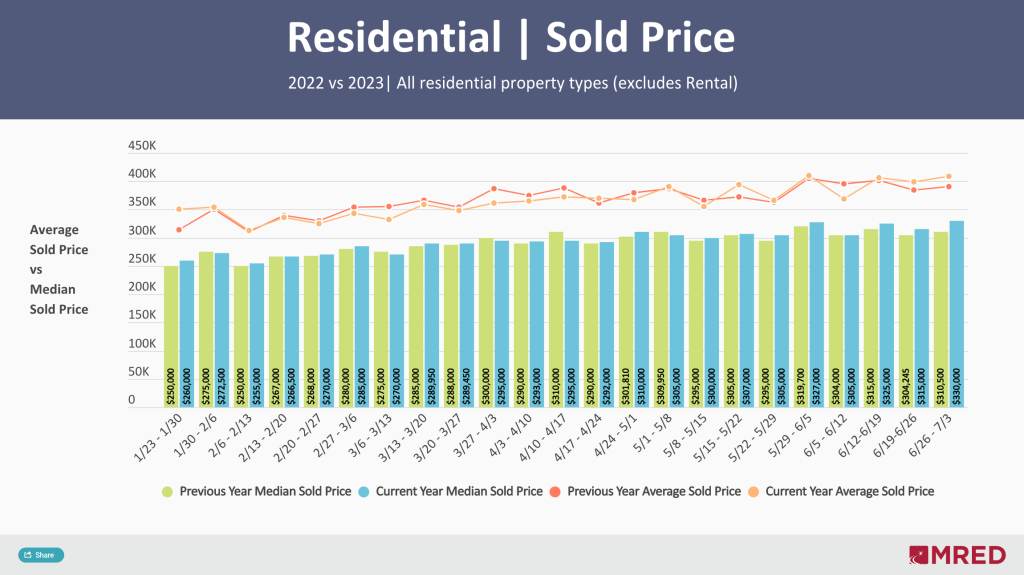 MRED’s residential marketplace saw 4,744 new listings during the first full week of July, which included the holiday. That mark was a 4% week-over-week decrease and a 29% year-over-year decrease. This was the third straight weekly decline in that metric, which had just seen three consecutive weeks of increases.